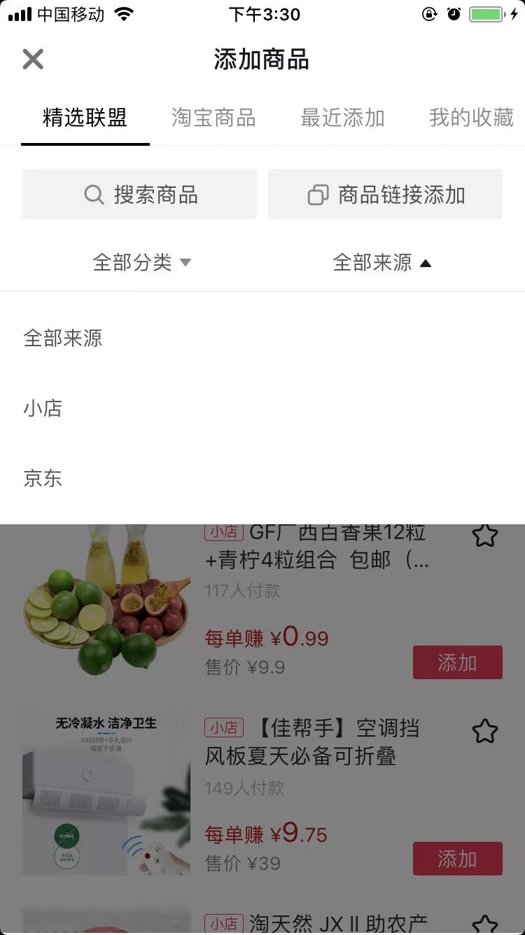 a.发布视频时在视频中添加商品,发布视频时,选择“添加商品”,选品页第一个页面即为精选联盟商品;